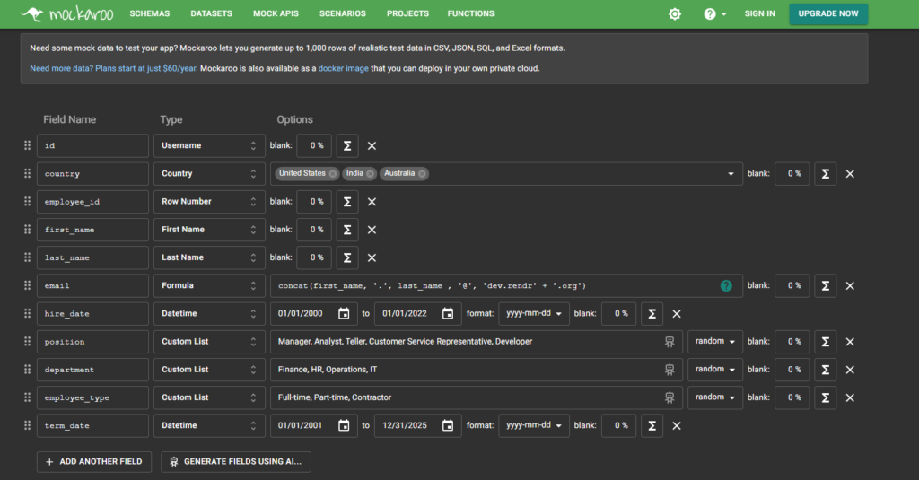 Login to Mockaroo to generate 1000 records of Random Data, specify the attributes